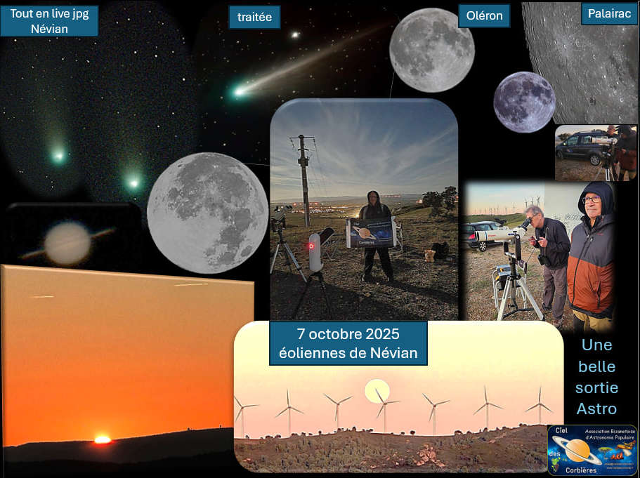 Une journée avec Ciel des Corbières: passage d’un bolide capturé avec notre caméra fripon, la comète C/2025 A6 (lemmon), Saturne, la pleine lune d’Oléron à Palairac et sous les éoliennes de Névian, Jupiter dans la constellation d’Orion, Vénus apparait à l’Est, avec un lever de soleil embrasant l’horizon du massif de la clape, tout doucement s’éclaire: la montagne noire avec le pic de Nore, l’Alaric, le Canigou, Pic St Loup et tous ces monuments lointains mais proches de nous avec nos outils….