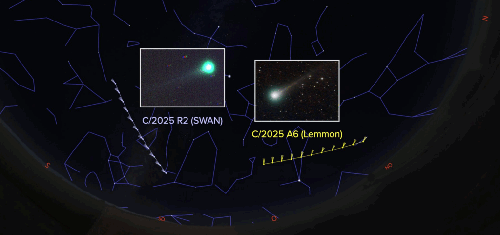Découvertes respectivement en janvier et septembre 2025, les comètes C/2025 A6 (Lemmon) et C/2025 R2 (SWAN) s’invitent dans le ciel nocturne d’octobre.