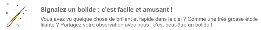 Toujours surprenant de voir passer un objet brillant, rapide, descendant …. et disparaitre aussi soudainement que son apparition. C’est l’aventure vécue d’un de nos membres de l’association. Il faut garder en mémoire « Où je me trouve, la direction de l’événement, l’heure et le temps écoulé …. «